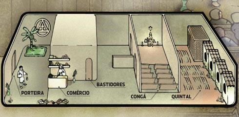 O espaço sagrado do terreiro, onde o rito acontece (mais detalhes na página ao lado). Geralmente um salão retangular de paredes brancas. Na frente ficam médiuns e auxiliares, e atrás, o público. Na hora da incorporação, a platéia vai até os médiuns para se consultar. Em alguns locais, o piso é de chão batido ou areia.