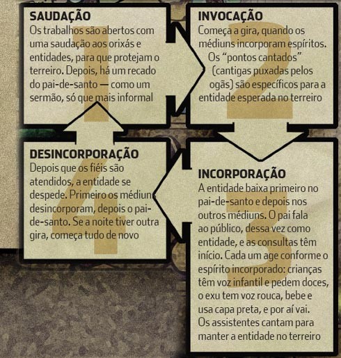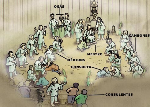 Você conta seu problema, e a entidade incorporada passa "o preceito", a prescrição que deve ser cumprida, muitas vezes envolvendo oferenda e pendendo, o médium "faz o passe", ou seja, anula as suas vibrações negativas.